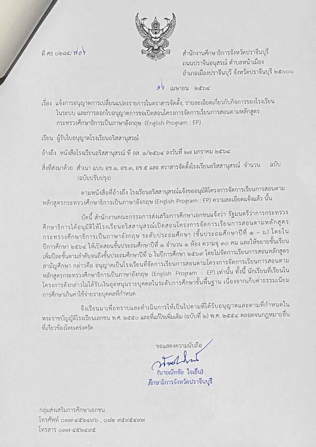 หนังสือจากสำนักงานศึกษาธิการจังหวัดปราจีนบุรี